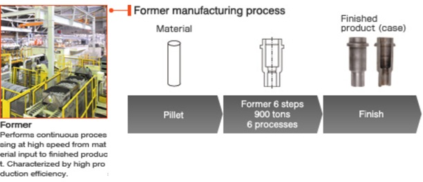 By eliminating the cutting process, we have dramatically improved functionality including strength as well as accuracy of a product and manufactured a wide variety of cold forging parts such as tooth forms, deep holes and large parts with fully enhanced production equipment including formers. We also actively promote method development including cost and manufacturing efficiency by original mold design and jig manufacturing to improve technology supporting cold forging.